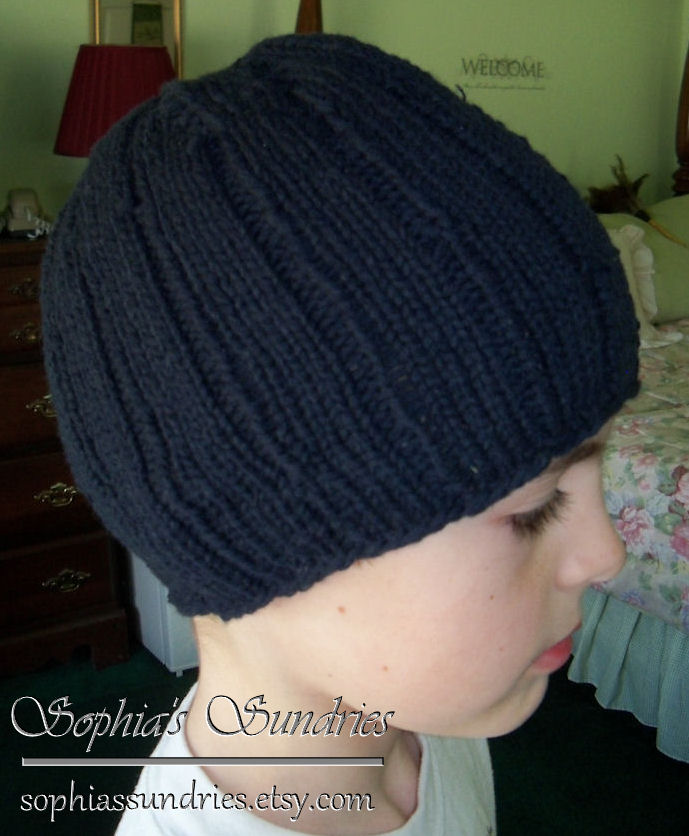This one probably doesn't look very interesting, but it's super-warm and super-soft. It's a lot like the Rib-a-Roni hat, but this one uses bulky yarn. It's really fast and easy to make, and it's a great introduction to ribbing. If you've never done it before, you'll be an expert by the time you're done with the hat. :)